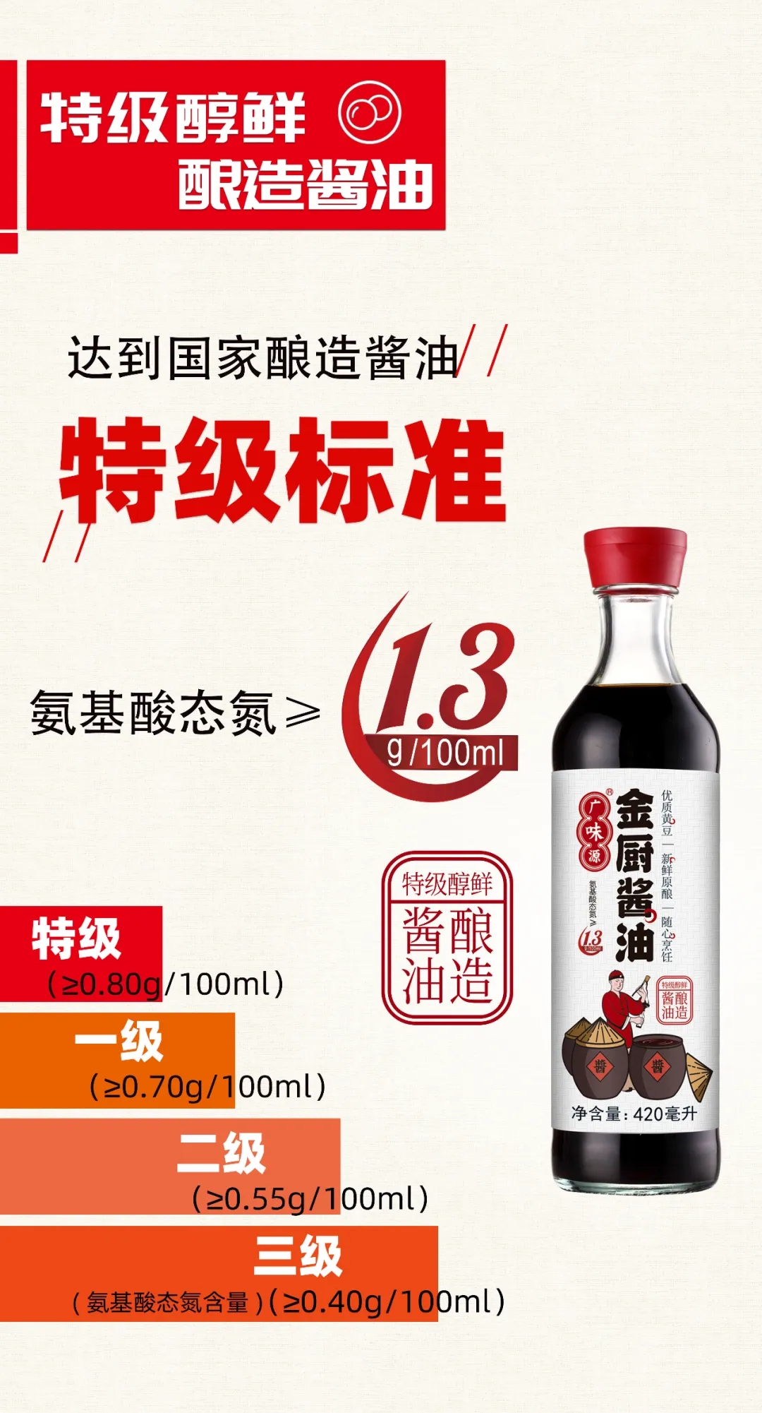 金廚近期推出一款高檔次“觀音瓶”獨(dú)特造型的醬油,它,不僅擁有醬油最原始的新鮮味,也讓我們的生活變得更加時(shí)尚“新鮮”。與其他醬油釀造技術(shù)不同,金廚醬油有著獨(dú)家的調(diào)配配方——“頭道新鮮釀·萃技術(shù)”。也就是說(shuō),它從黃豆釀造到頭道萃取,全程采用“新鮮釀·萃”,零添加,純粹無(wú)負(fù)擔(dān)。最后,精粹出釀曬缸第一道新鮮原液。這樣萃取出來(lái)的頭道原醬,鮮醇而不澀,讓你吃到醬油最自然的醇香!同時(shí),金廚醬油氨基酸態(tài)氮每100ml含量高達(dá)1.3g,營(yíng)養(yǎng)更豐富。